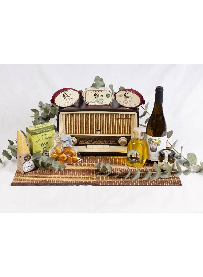 Agasalla calidade con esta cesta de albariño, licor de hierbas y tres conservas